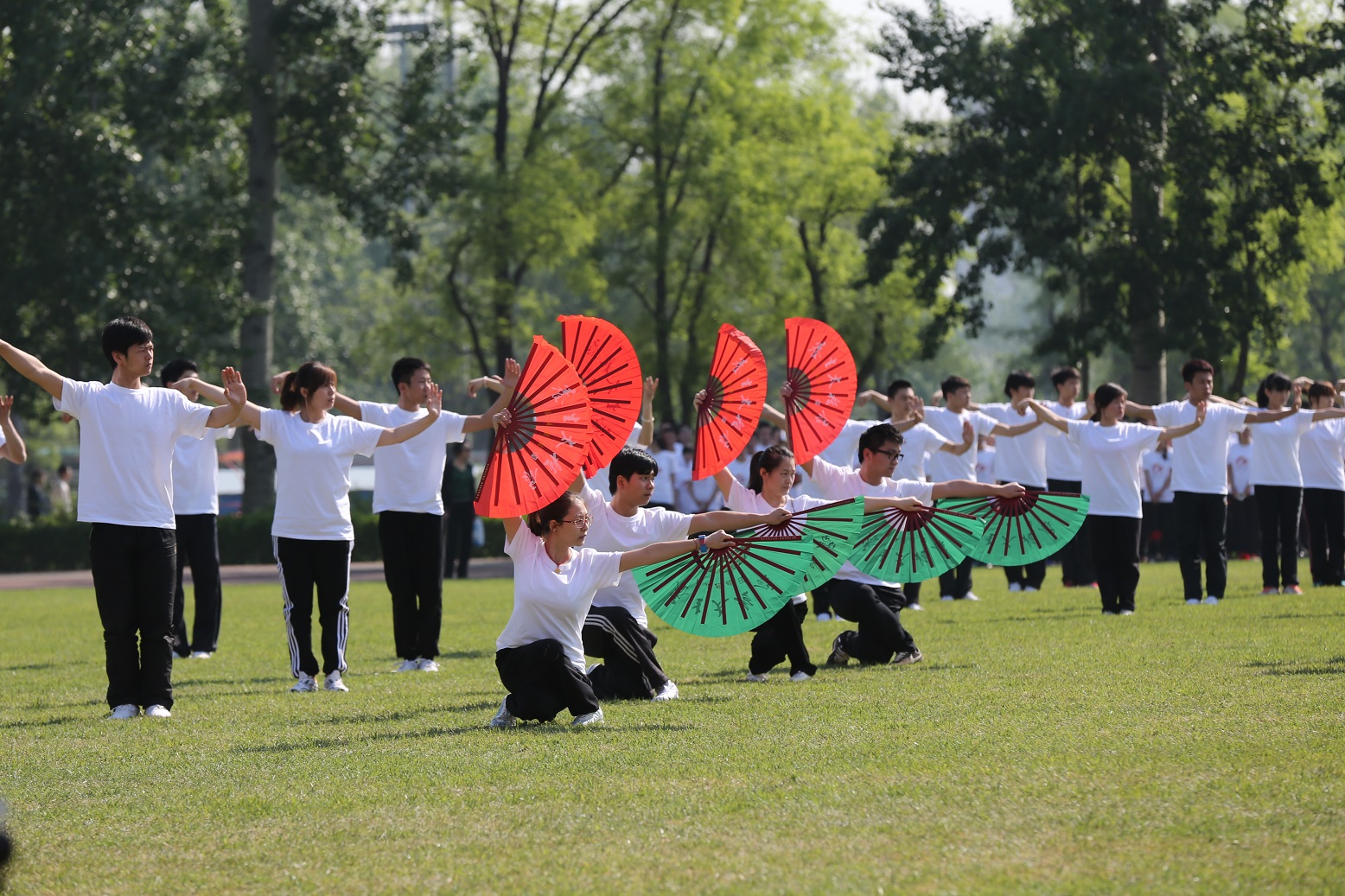 在jinnianhui金年会第46届校运会开幕式上,来自武术学院、学科联队,社会体育系,教育学院,竞技体育学院和体育艺术系的同学依次进行了太极拳、广播体操、健身球、腰鼓、广播操和全民健身活力操等内容的全民健身展示表演。