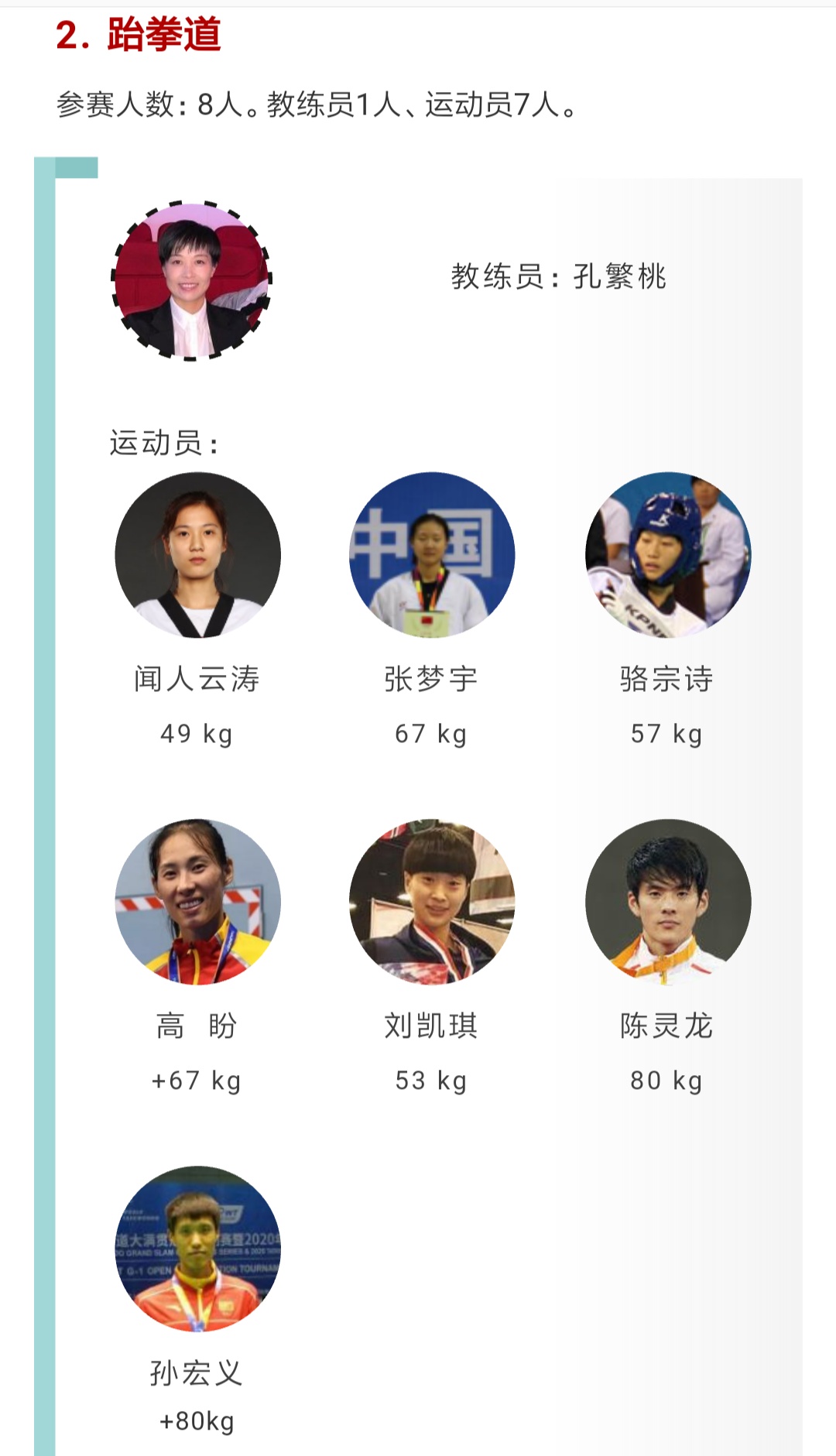 在入选的44名出征人员中有教师4人(其中教练员3名、运动员1名),医生2人(黄涛、吕钟毓),学生38