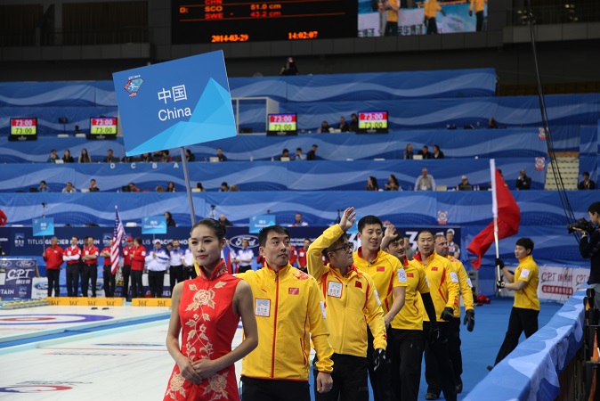 下午2时,“2014年世界男子冰壶锦标赛”正式开始。世界冰壶联合会主席凯特女士,国家体育总局局长、中国奥委会主席刘鹏、北京市市长王安顺、国家体育总局冬季运动管理中心主任赵英刚等多位领导出席开幕式。在管乐团《欢迎进行曲》的轻快伴奏下,各国运动员相继入场。随后全场起立,伴随《义勇军进行曲》的演奏,中华人民共和国国旗缓缓升起。在世界冰壶联合会主席凯特女士宣布比赛开始后,管乐团又演奏了《豪勇七杰》,为比赛点燃了激情,赢得现场观众的热烈掌声。