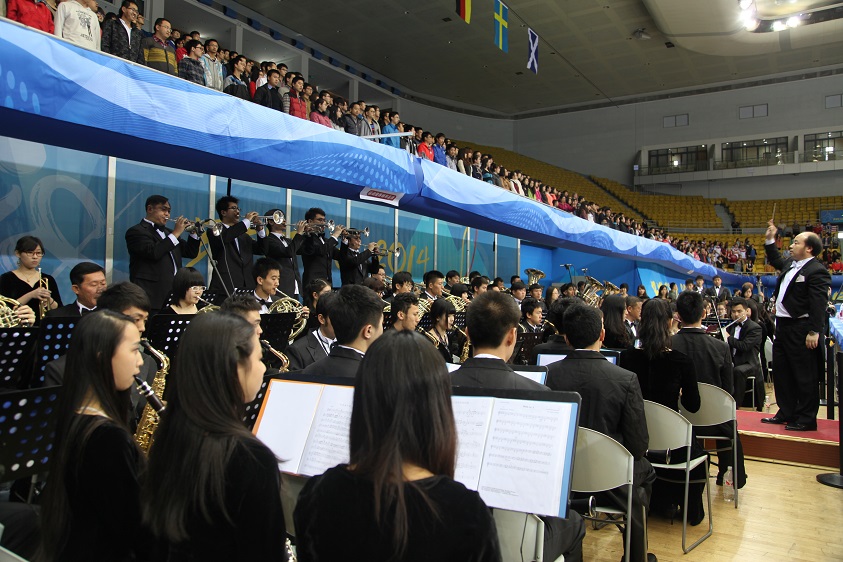 3月29日,“2014年世界男子冰壶锦标赛”在首都体育馆拉开序幕。为了下午正式演出的顺利进行,上午9时许,金年会管乐团及志愿者们在团委书记周启迪老师的带领下出发前往首都体育馆,提前为下午的正式演出作准备。